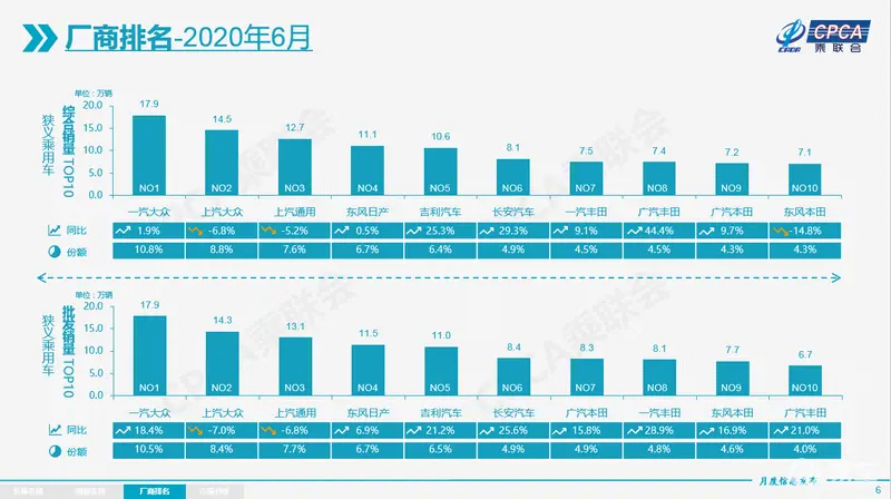 在6月份的车企销量排行榜TOP10中,日系车企已经占据一半的位置。从6月份的零售份额来看,日系品牌的份额约为25.9%,虽然低于德系品牌的27%;但在批发份额中,日系却已然达到26.4%,高于德系的25.9%,日系主力品牌全面走强。