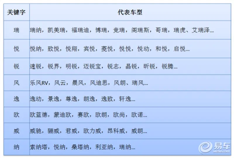 可以看出,在汉字中,瑞、悦、锐最受欢迎。对照下面的详细列表,看看这些车型是不是经常出现在我们视野中?