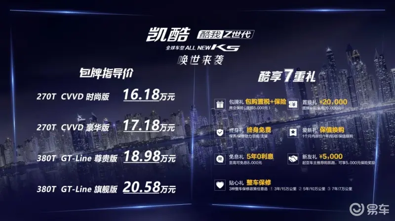 上市当晚,官方给出凯酷K5的指导价为16.18万-20.58万元。但包牌之后,就意味着,凯酷K5给用户起步就优惠两万,里面包含了全额购置税(15,000元左右)和定额5000元的商业保险。