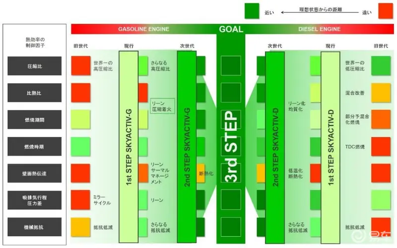 研究发动机的人都知道,压燃是汽油机效率趋近极限的工作方式,是减少能源消耗的利器。奔驰、通用很久前就做过技术验证,只是没坚持到量产。只有马自达,赌上了未来相当长时间的技术方案,把它量产。
