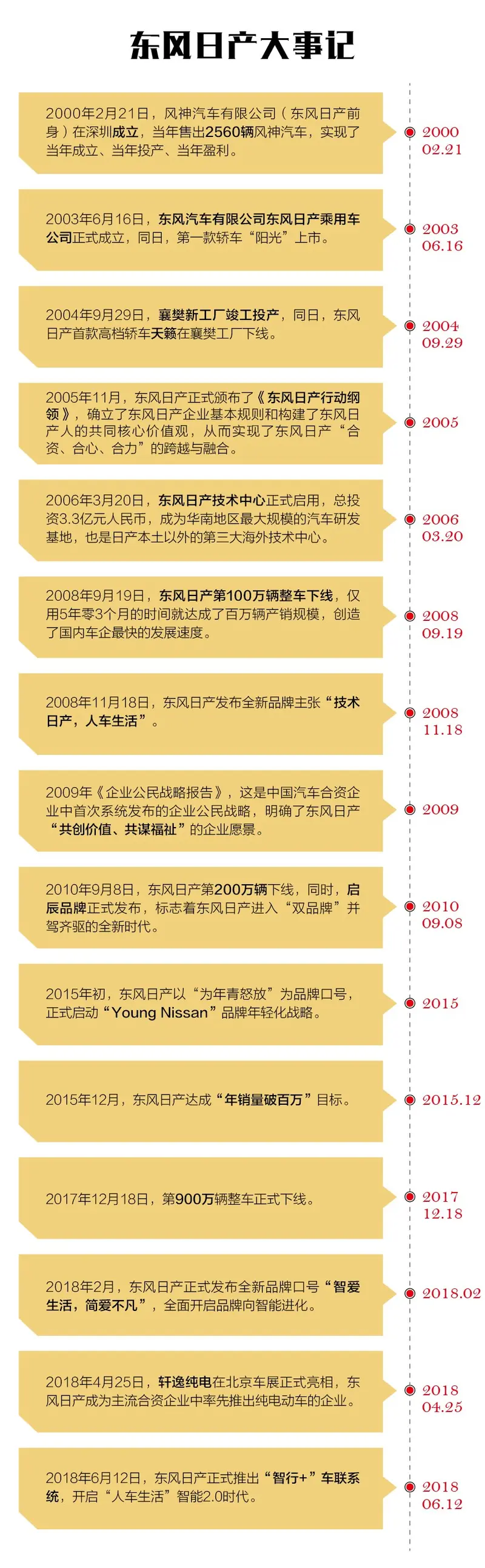 成立于2003年的东风日产,从无到有,从行业的一只丑小鸭,到历经合资初期的阵痛,再到快速发展、稳健前行,已经成长为拥有动感、舒适、SUV三大产品阵营,产销突破百万辆、产值突破1600亿、用户保有量接近一千万的行业领先者。