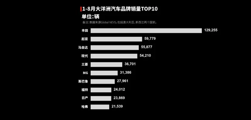 但最近几个月,澳洲新能源车的销量也在快速增长。根据澳大利亚汽车工业联合会(FCAI)的数据,8月,比亚迪在当地的单月销量已经超过了特斯拉。而且在8月,已经有4个中国品牌进入了当月销量Top10。