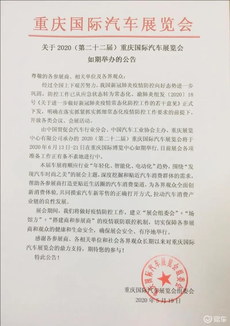 日前,重庆国际汽车展览会组委会表示,重庆国际汽车展览会将于2020年6月13日-22日在重庆(悦来)国际博览中心举行,本届车展举办时间从原来的7天延长至9天。预计参展品牌超过80家,参展汽车达1000多辆。