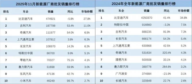 比亚迪依然稳居第一,但同比下滑的销量以及市场份额,让后来者看到了更多机会。