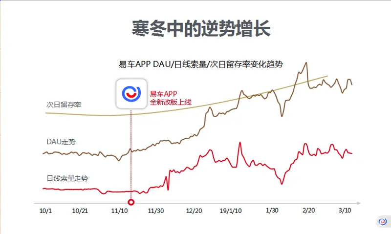 从易车来看,我们从2018年10月起进行了品牌换新,相信各位嘉宾也感受到了易车现在在整体品牌形象、传播、App上体现出的变化。效果方面,易车App换新后在用户留存、DAU和数据走势等指标上,都进入上升通道。