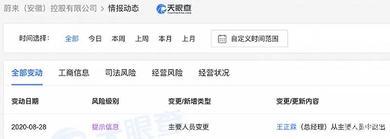 日前,数据显示,蔚来(安徽)控股有限公司发生主要人员变更,王正霖卸任公司总经理。