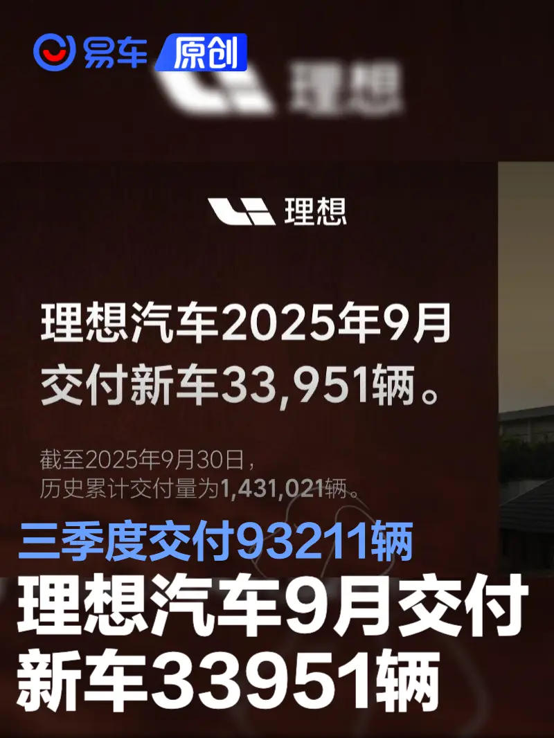 易车讯 10月1日,理想汽车公布2025年9月交付数据。2025年9月,理想汽车交付新车33951辆。2025年第三季度,理想汽车交付93211辆。截至2025年9月30日,理想汽车历史累计交付量为1431021辆。