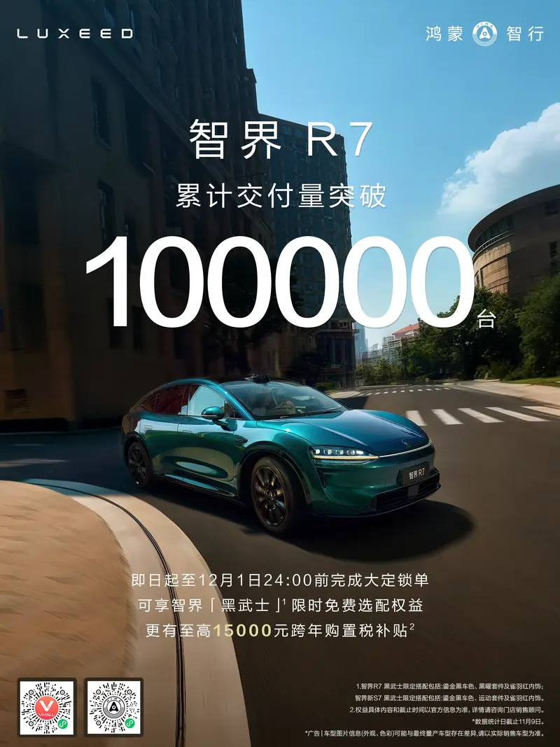官方表示,2025年11月4日至12月1日,选购智界R7可享“限时免费选配价值2000元的黑曜套件、价值6000元的雀羽红内饰,同时鎏金黑车色支持免费选配”。若在2025年12月1日24:00前完成大定锁单并确认交付方案,还可叠加享受至高15000元跨年购置税补贴,整体至高可享58794元的超值权益。