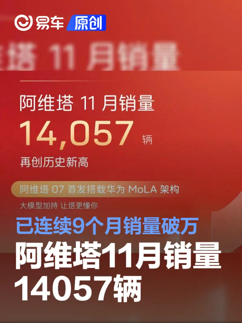 易车讯 12月1日,阿维塔公布2025年11月销量成绩。11月阿维塔家族销量14057辆,同比增长21%,再创历史新高,并已连续9个月销量破万。