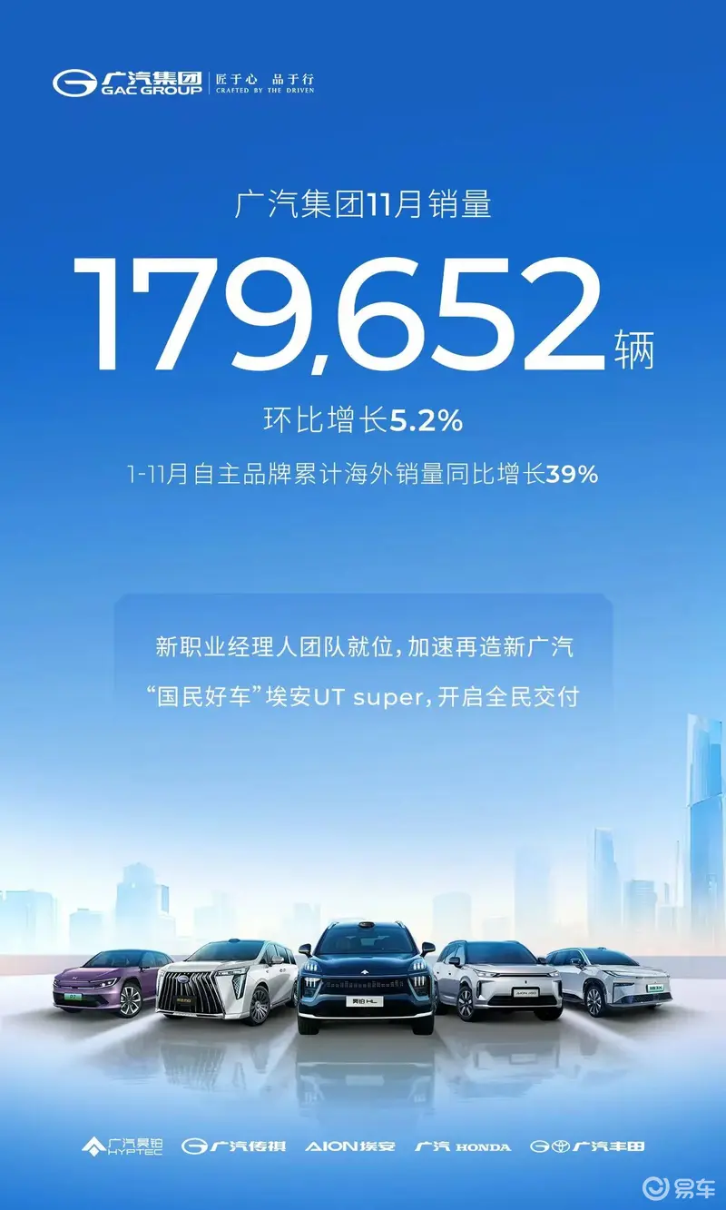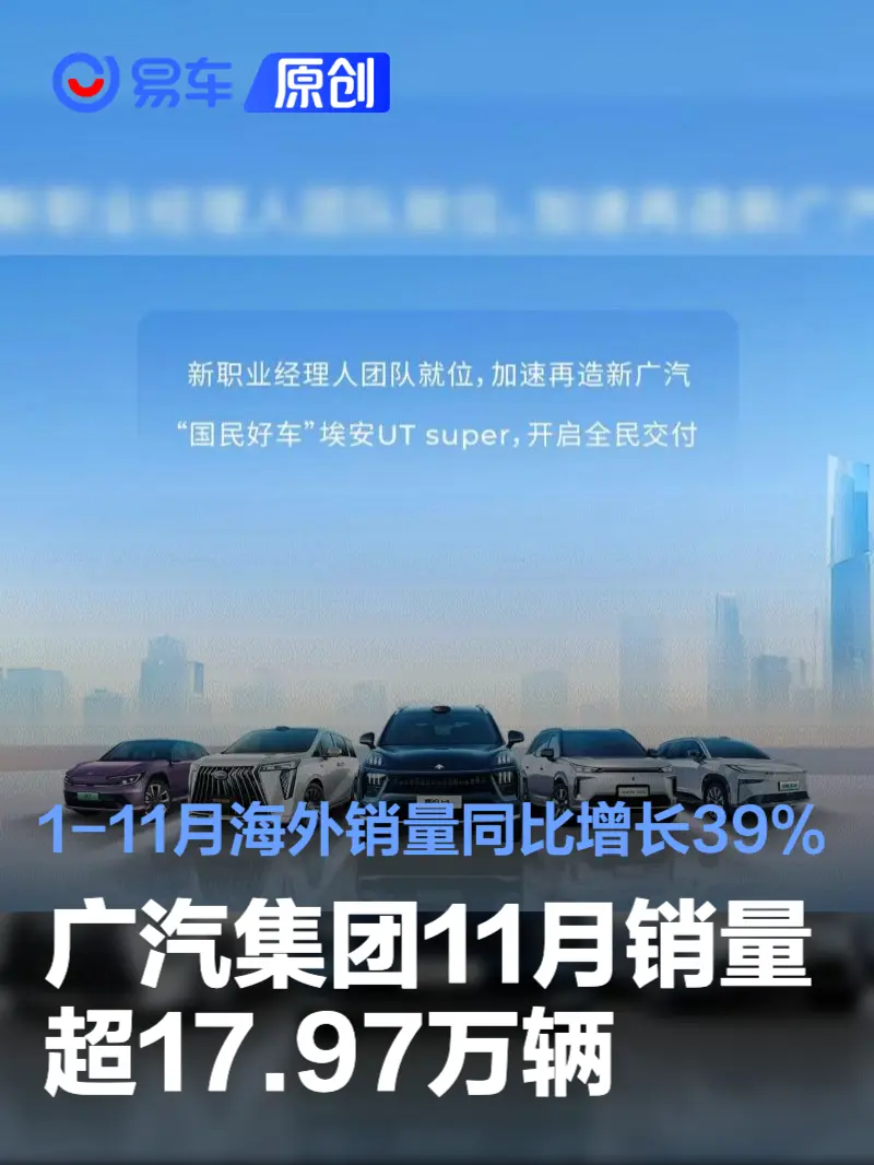 易车讯 日前,广汽集团发布2025年11月产销公告。广汽集团11月汽车销量17.97万辆,环比增长5.2%。1-11月,广汽自主品牌累计海外销量同比增长39%。