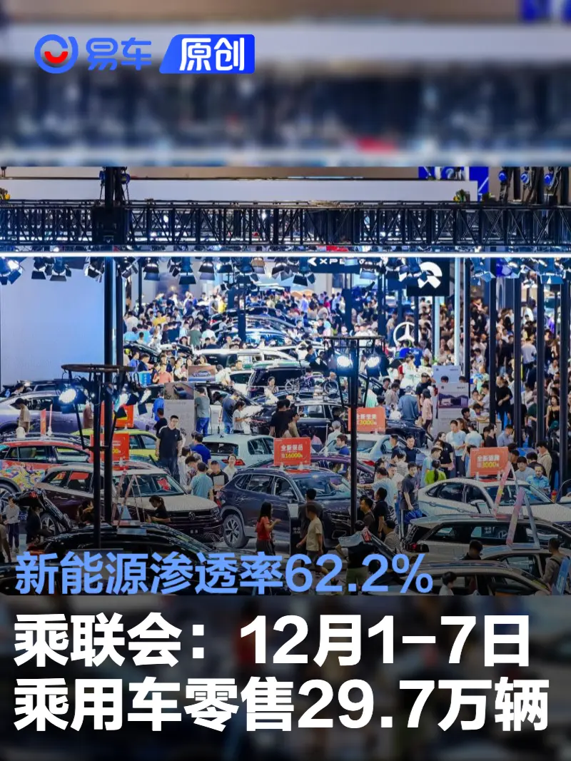 12月1-7日,全国乘用车市场零售29.7万辆,同比去年12月同期下降32%,较上月同期下降8%;今年以来累计零售2,178.1万辆,同比增长5%。