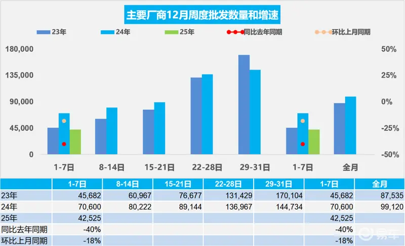 12月1-7日,全国乘用车厂商批发29.8万辆,同比去年12月同期下降40%,较上月同期下降18%;今年以来累计批发2,706.3万辆,同比增长10%。