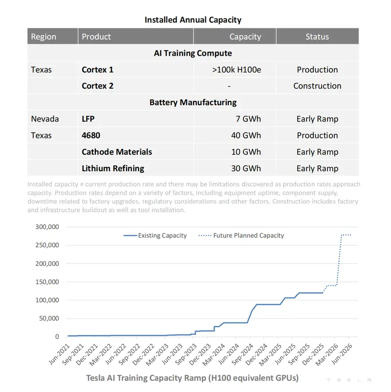 特斯拉将致力于实现 100GW 的太阳能电池产能,除了为人工智能数据中心供电外,利用太阳能和储能系统,还可以为电网增加大规模的可用容量。