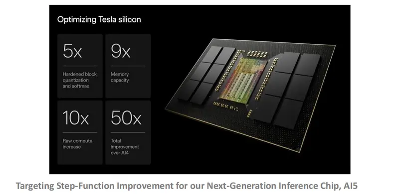 2025年第四季度,特斯拉自主研发、定制设计的AI5和AI6自动驾驶推理芯片持续取得进展,计划分别于2027年和2028年投入量产。相较于AI4,AI5的整体性能有望提升50倍,这主要得益于算力提升10倍、内存容量提升9倍,以及强化模块量化和softmax功能提升5倍(后者可在不牺牲模型精度的前提下,实现高效的低精度计算)。