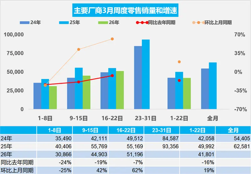 3月第三周全国乘用车市场日均零售5.1万辆,同比去年3月同期下降7%,较上月同期增长62%。