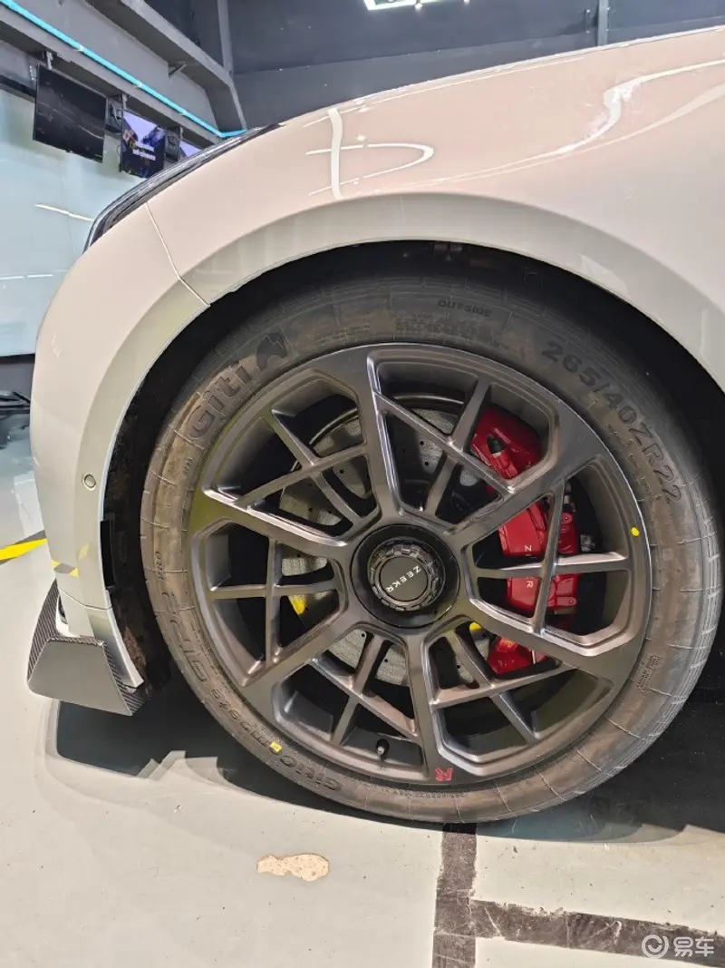 此前,官方表示极氪001 FR配备轻量化高性能锻造轮圈及碳陶刹车盘,进一步提升操控及行驶稳定性。通过曝光的图片看到,新车采用了22寸的佳通赛事GTR2轮胎,其采用方程式赛车和GT赛事的轮胎技术,专为赛道而设,采用不对称的轮胎花纹。