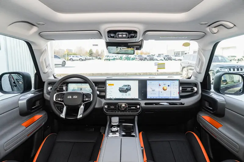 内饰中控台与副驾采用双联屏的设计,全系标配10.25英寸液晶屏、12.8英寸中控屏、12.8英寸副驾屏、9英寸流媒体后视镜,车机配备高通骁龙8155芯片,支持AI语音情景式对话,新车提供10扬声器音响+独立功放。