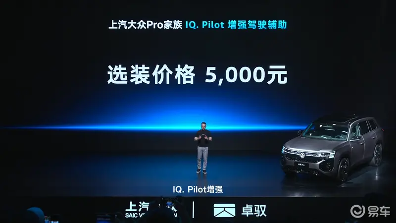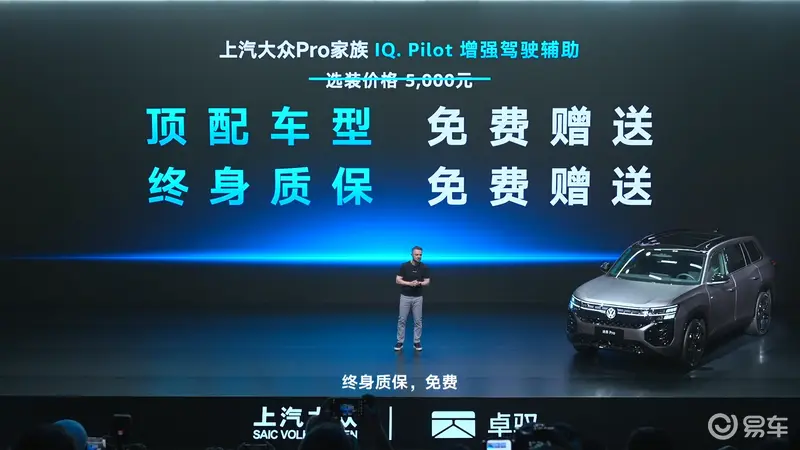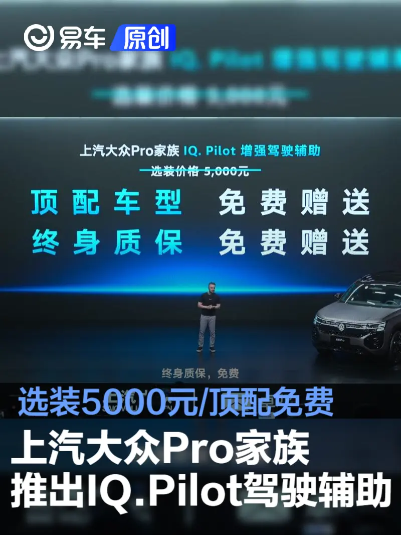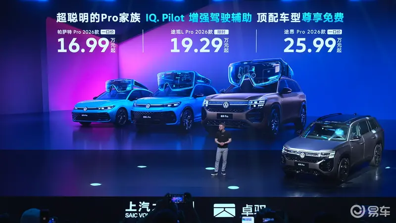 易车讯 9月29日,上汽大众召开TECHDAY技术发布会,2026款上汽大众Pro家族均搭载卓驭核心的惯导双目™立体视觉系统与IQ.Pilot驾驶辅助系统,选装价格5000元,顶配车型免费赠送,另外终身质保同样免费赠送。同时,2026款Pro家族延续此前一口价定价模式,帕萨特Pro 2026款一口价16.99万元起,途观L Pro 2026款限时19.29万元起,途昂Pro 2026款一口价25.99万元起。