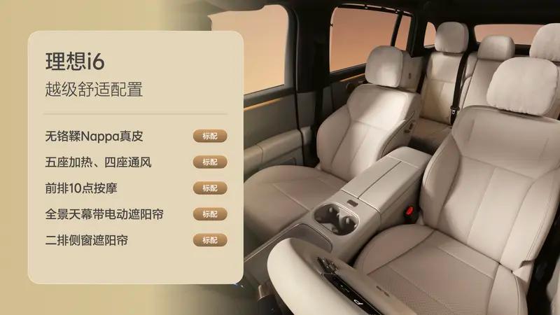 内饰方面,新车继续采用了家族式的设计,整体与理想i8看齐。新车提供三种配色方案,分别是白色内饰、灰棕色内饰、橙黄色内饰。前排配备了中控屏与副驾屏。主驾驶座椅前方则是通过HUD抬头显示展示行车信息。中央岛台区域拥有横向的储物格,在其前方是手机无线充电面板。