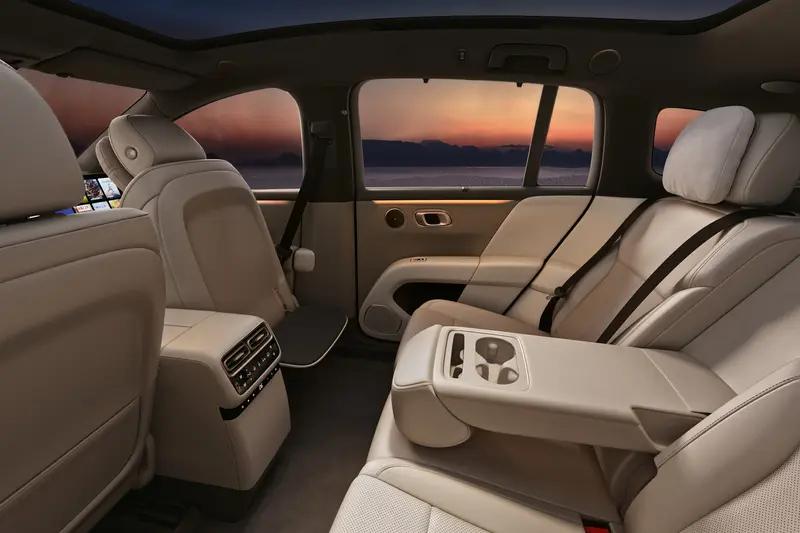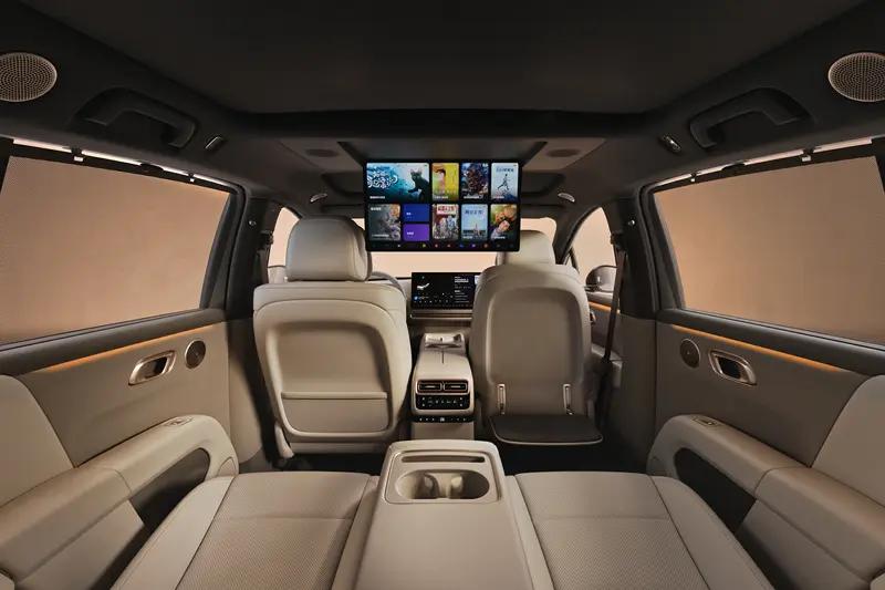 此外,新车后排还配备了21.4英寸3K吸顶折叠屏,没有吸顶屏的车型采用了全景天幕,并提供电动天幕遮阳帘。同时,后排座椅中央也有宽大的扶手,副驾座椅还可以向前移动,为右后座提供专属的脚托踏板,后排座椅还有专属的头枕靠枕。此外,后排中央处还提供了冷暖双用冰箱。
