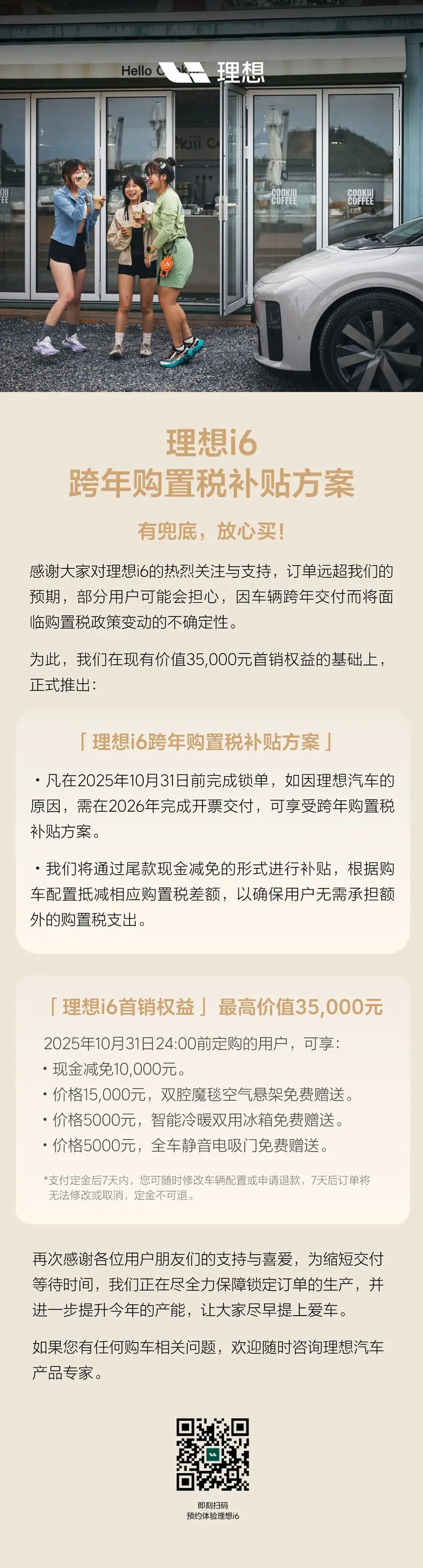 易车讯 9月30日,理想汽车宣布推出理想i6跨年购置税补贴方案。理想汽车表示,理想i6订单远超我们的预期,部分用户可能会担心,因车辆跨年交付而将面临购置税政策变动的不确定性。