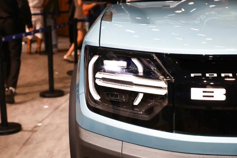 新车前格栅上宽大可点亮的BRONCO字标与升级后的数字化大灯相连,形成极具视觉冲击效果的贯穿灯带,辨识度极强。此外,新车引擎盖集成真实的贯穿式风道,不仅具有科技美感更能引导气流、降低风阻,优化续航里程。