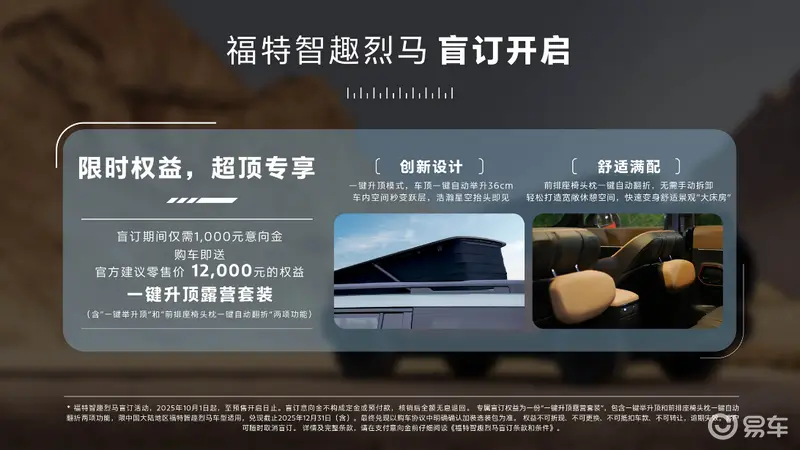 易车讯 10月1日,福特智趣烈马正式开启盲订。即日起至预售开启前,用户仅需通过“福特纵横小程序”支付1,000元盲订意向金,成为福特智趣烈马盲订客户,即可获赠官方建议零售价人民币12000元的“一键升顶露营选装包”,包含行业首创的原厂电动举升顶和前排座椅头枕一键自动翻折两项功能,打造跃层式车内空间,尽享星空视野。