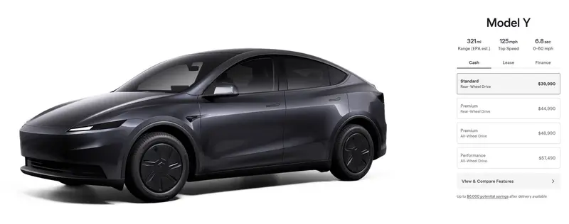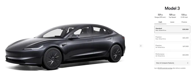 易车讯 北京时间10月8日,特斯拉Model 3 Standard与Model Y Standard正式发布。作为Model 3/Y入门版车型,两款车型在配置部分进一步精简,其中Model 3 Standard美国市场起售价为36990美元(约合26.34万元人民币),相比原有入门版车型(后驱长续航版)售价下调5500美元。Model Y Standard美国市场起售价为39990美元(约合28.47万元人民币),相比原有入门版车型(后驱长续航版)售价下调5000美元。据悉,Model 3 Standard与Model Y Standard将于未来几周在美国市场开启交付。