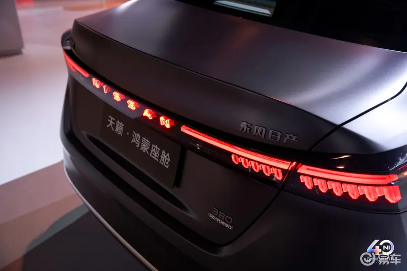 来到车尾,可以看到新车尾部设计延续前脸简洁风格,同样采用一体化造型方案,尾灯组中的NISSAN光标及两侧镶嵌的11枚宝石灯体,极具辨识度与精致美感,构建出更具智能化的视觉风格。此外,新车重点对智能化方面进行升级,首次引入了华为鸿蒙座舱HarmonySpace 5和HUAWEI SOUND。动力方面,新车搭载2.0T VC-Turbo发动机,最大功率243马力(179千瓦),最大扭矩371牛·米,传动系统为CVT无级变速箱。