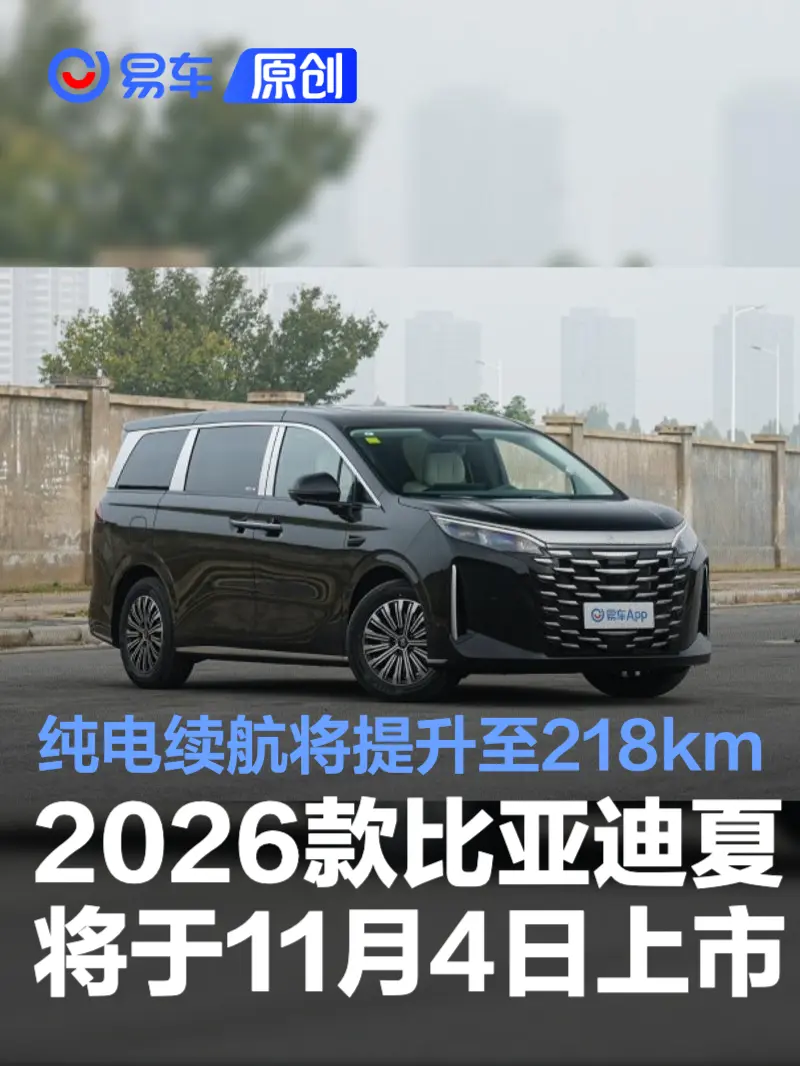 易车讯 10月28日,我们从官方获悉,2026款比亚迪夏将于11月4日上市。从此前曝光的消息看,比亚迪夏将配备激光雷达,纯电续航将提升至218km,预计配置也会有所升级。