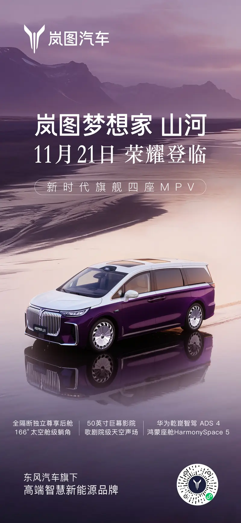 易车讯 11月11日,岚图汽车官方宣布梦想家 山河将于广州车展迎来正式上市。新车与普通版车型最大的区别为采用了四座版车型,并使用了双色车身设计。官方表示,新车将于2025年四季度开启交付。