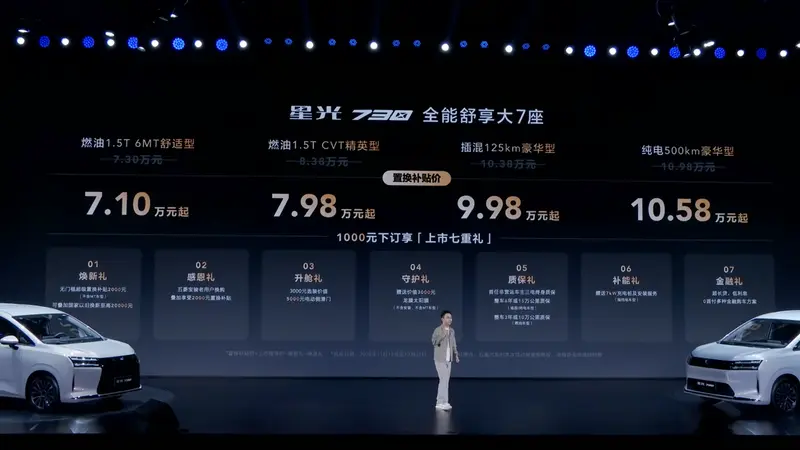 易车讯 11月12日,五菱星光730迎来正式上市,新车共推出4款车型,官方指导价7.30-10.98万元,置换补贴价7.10-10.58万元。同时,官方推出焕新礼、感恩礼、升舱礼、守护礼、质保礼、补能礼、金融礼。新车基于原生天舆架构平台,搭载灵犀动力3.0、神炼电池以及50+项油电同配配置。