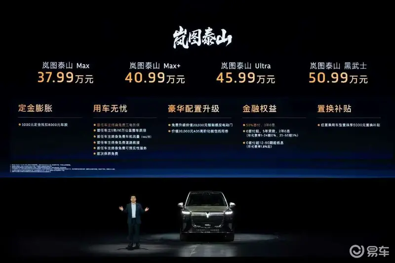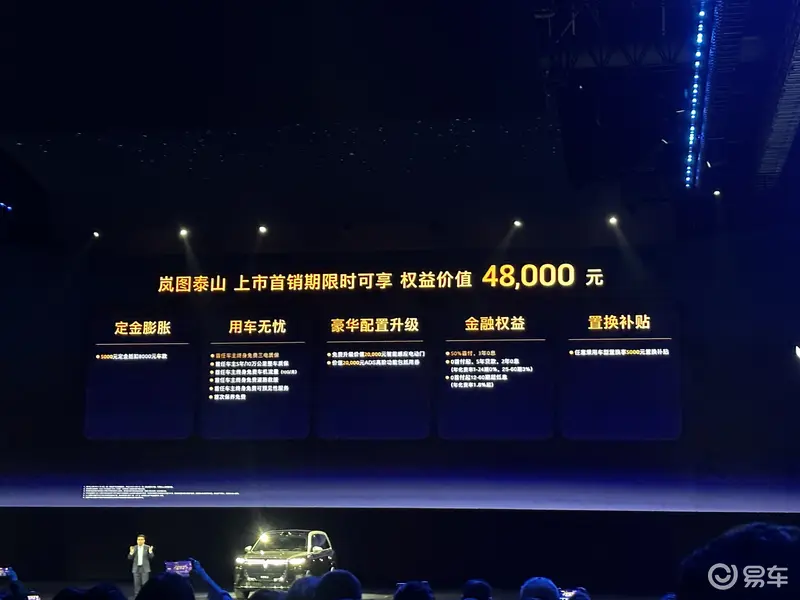 同时官方宣布,岚图泰山上市首销期限时可享价值4.8万元权益,包括5000元定金抵扣8000元车款;首任车主终身免费三电质保;豪华配置升级等五重购车权益。