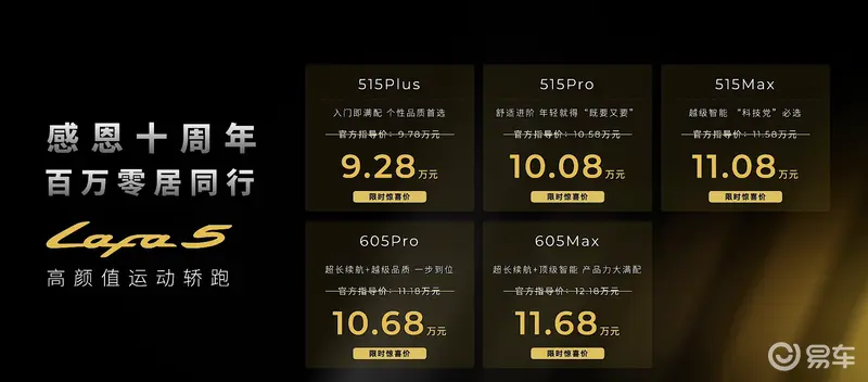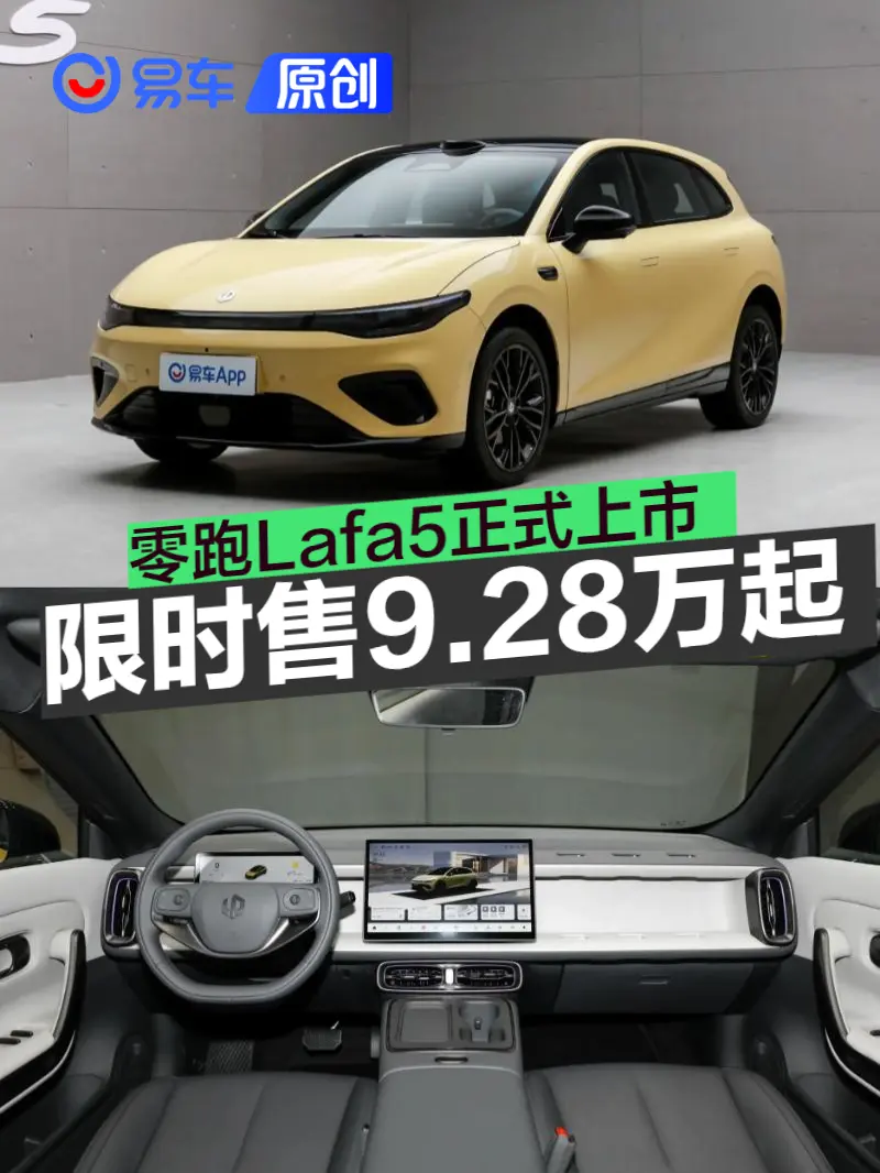 易车讯 11月27日,零跑汽车全新战略车型Lafa5正式上市,包含五款车型,官方指导价区间9.78-12.18万元;限时权益价区间9.28-11.68万元。Lafa5基于LEAP 3.5架构B平台打造,CLTC纯电续航里程分别为515km和605km。高性能Ultra版计划2026年上半年交付。