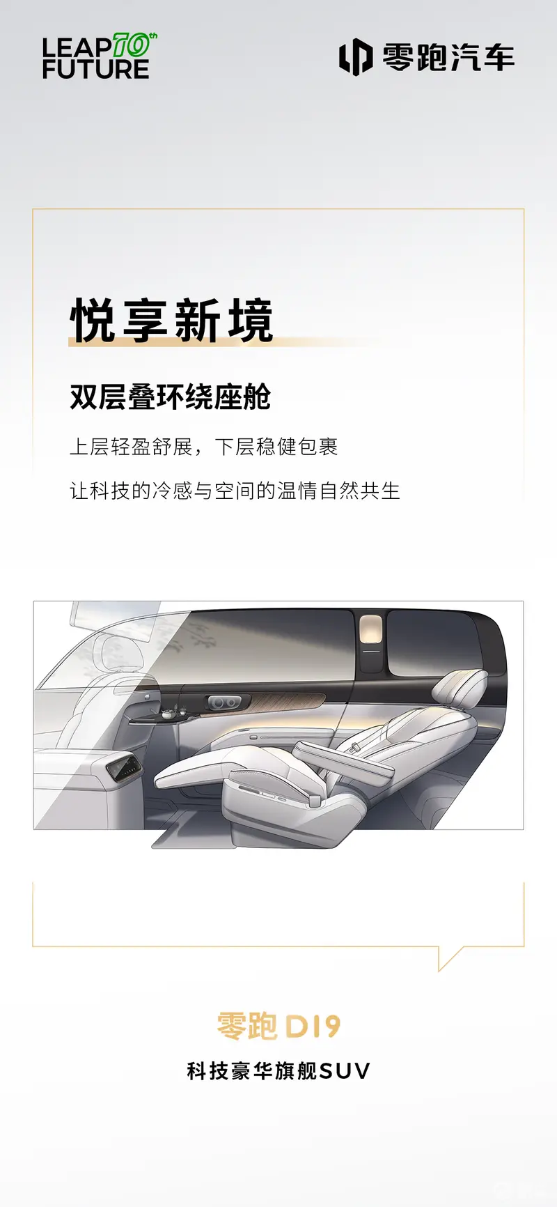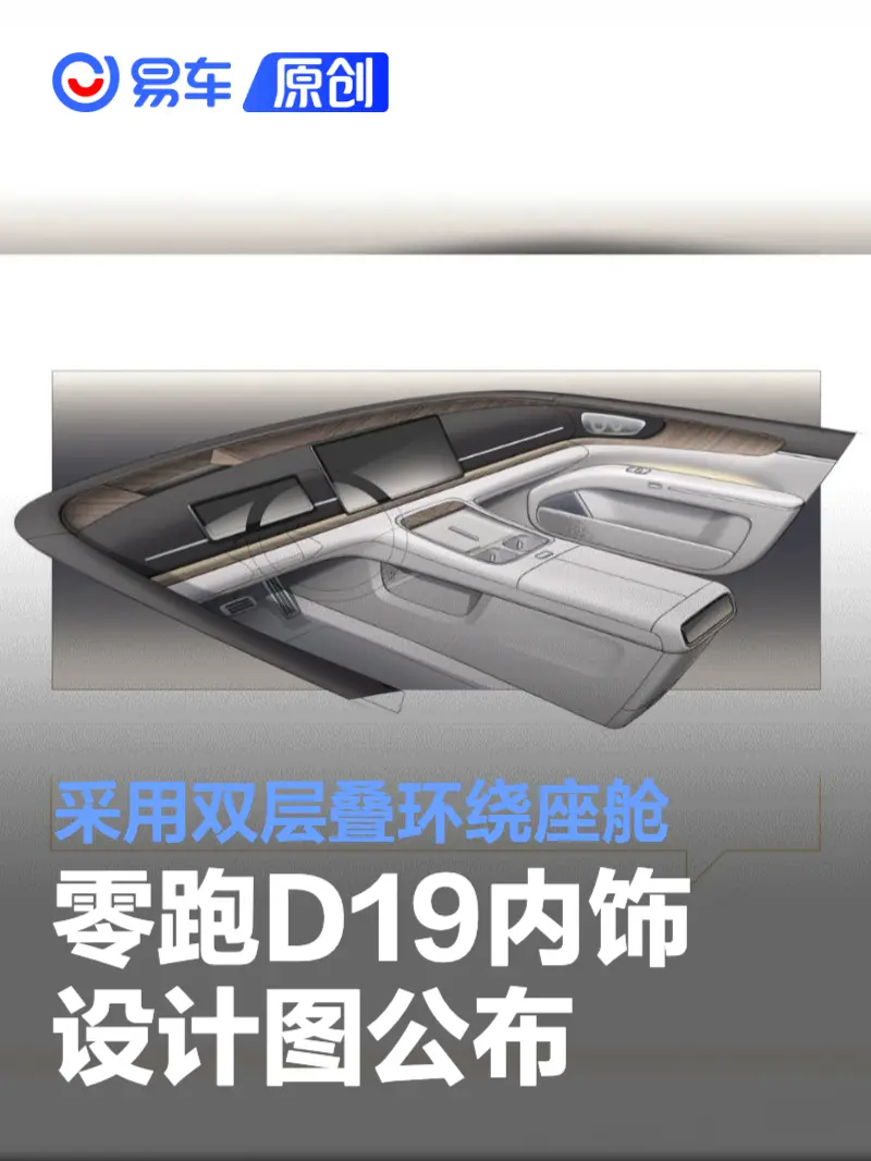易车讯 12月19日,零跑汽车发布了一组D平台首款车型零跑D19的内饰设计图,新车采用双层叠环绕座舱和超椭圆数字曲面设计。零跑D19已于11月1日正式开启盲订,支付999元意向金可享优先排产、 限量2000份创始人签名D19车模及后续活动优先参与权+尊享服务在内的多项权益。据悉,零跑D19将于2026年上半年上市交付。