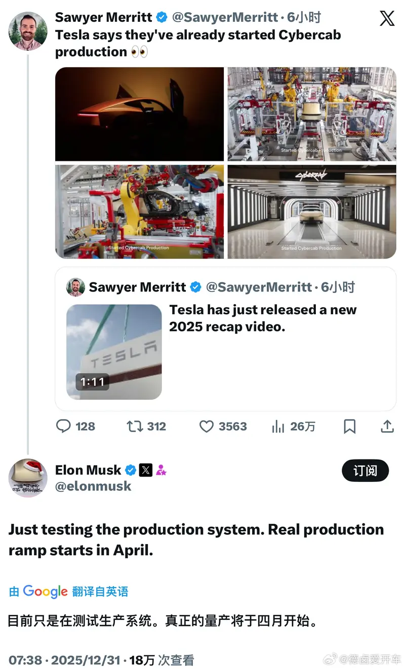 易车讯 近日,马斯克在社交媒体上透露,无人驾驶车型Cybercab将于2026年4月在得州超级工厂启动量产。目前该车已进入生产系统测试阶段,标志着特斯拉在无人驾驶商业化领域迈出关键一步。
