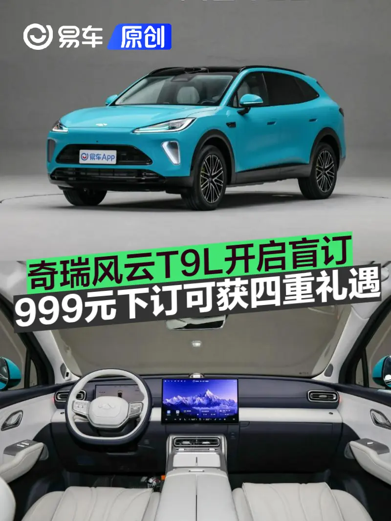 易车讯 1月17日,奇瑞风云T9L正式开始开启盲订,999元下订可获赠四重礼遇,包含先享礼、野趣礼、铁粉礼和无忧礼。新车定位为大五座SUV,配备猎鹰700+智能辅助驾驶系统、地平线征程6P芯片等,将在春节后正式上市。
