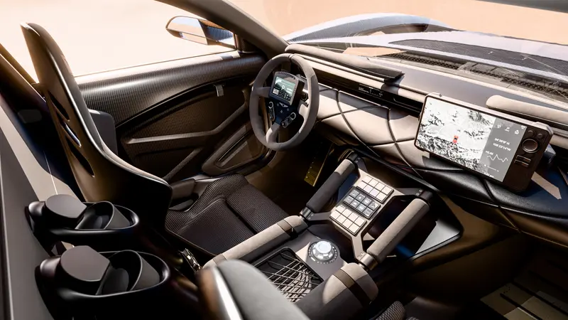 内饰方面,捷尼赛思配备了人体工学座椅、直观的操控布局以及恒温空调系统,旨在提升驾驶表现并有效缓解驾驶疲劳。仪表盘被巧妙集成于方向盘之上,使驾驶者在查看仪表信息的同时,视野始终不离前方路况。内饰还配备了一块可滑动显示屏,可在单人驾驶和双人领航模式间自由切换。醒目的安全抓手是车内重要的接触点,确保在颠簸行驶中的身体稳定性;而支持无级调节的显示屏位置,则让驾驶者与领航员能够始终专注于地形判断。