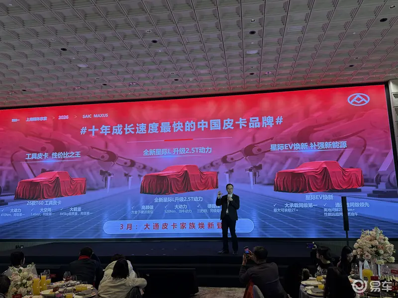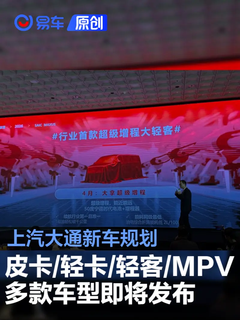 易车讯 2月2日,上汽大通发布新车规划,26款T60工具皮卡、全新星际L 2.5T、星际EV、新款大拿、大拿超级增程、大拿T2/T1换电版、全新大家9多款新车即将发布。