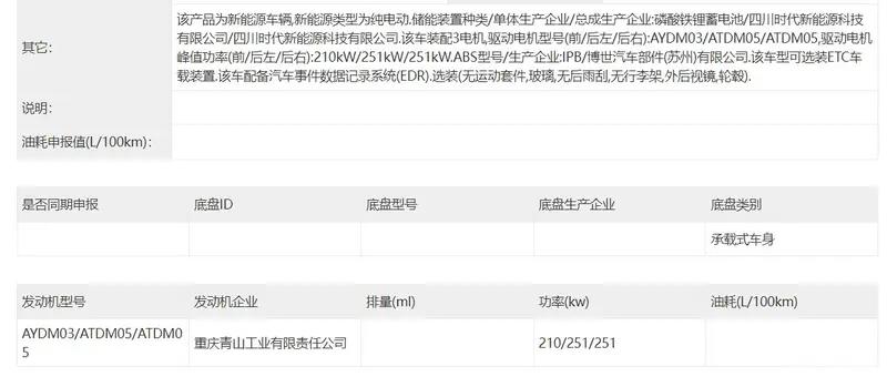 动力方面,预计新车将提供纯电+增程两种动力选择。而申报信息则为纯电版本,搭载三电机,最大功率分别为210千万、251千瓦和251千瓦。