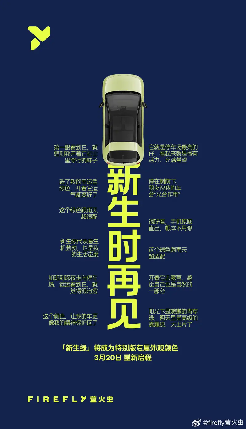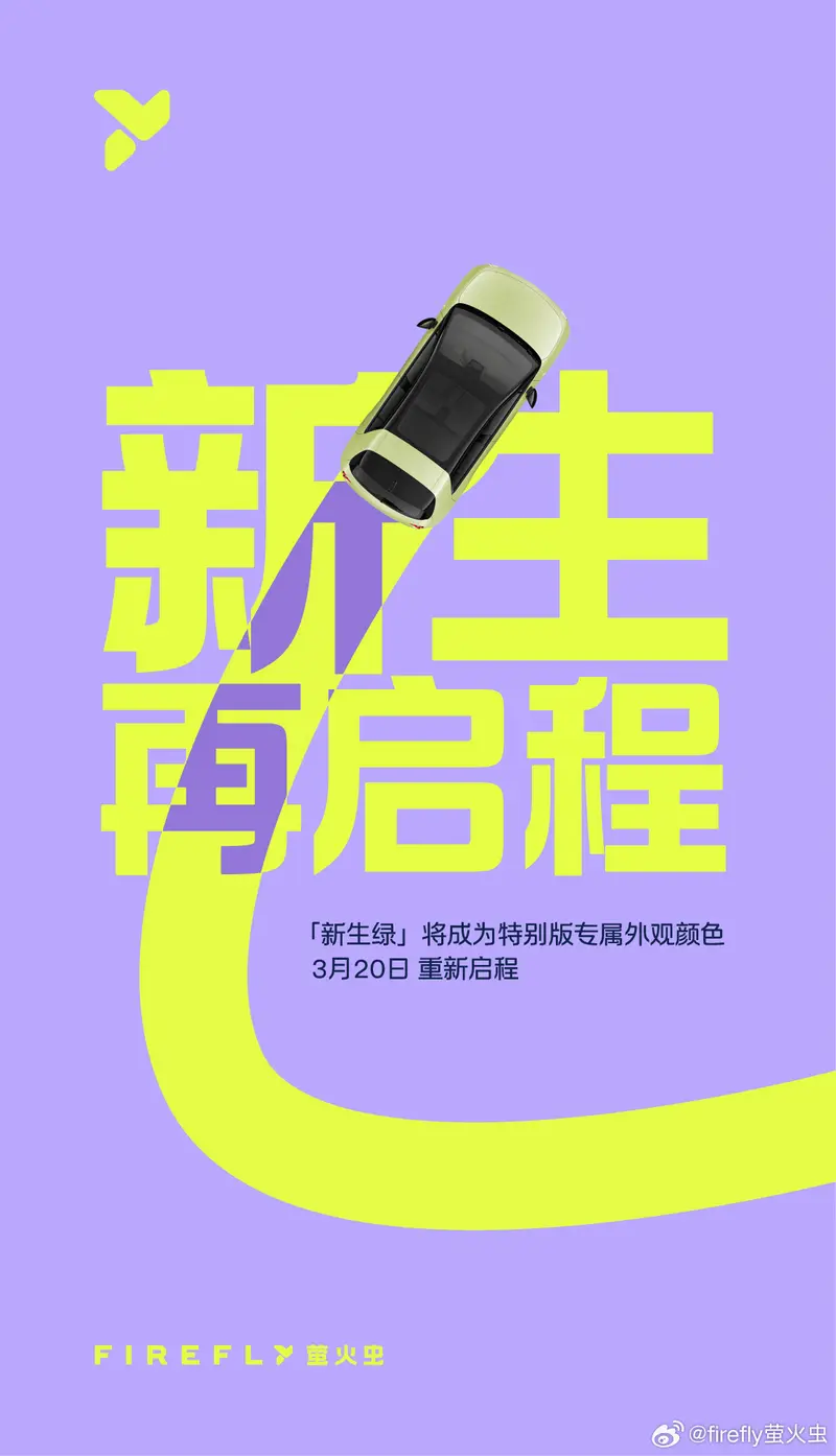 易车讯 3月19日,firefly萤火虫官方宣布将于3月20日推特别版车型。官方表示,新生绿将升级为专属外观色,灵感源自山野间的蓬勃生机。