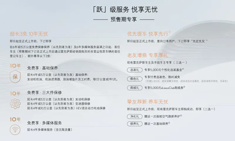 官方同步推出舒享副驾套装、多感纯享套装两款专属定制选装套装,价格分别为1.2万元和3万元,为用户提供豪华升级选择。同时,为满足用户个性化需求,全新一代ES提供多款选装色,价格为0.52万元。即日起,消费者可通过“eLexusClub”线上小程序或APP任一渠道下订。