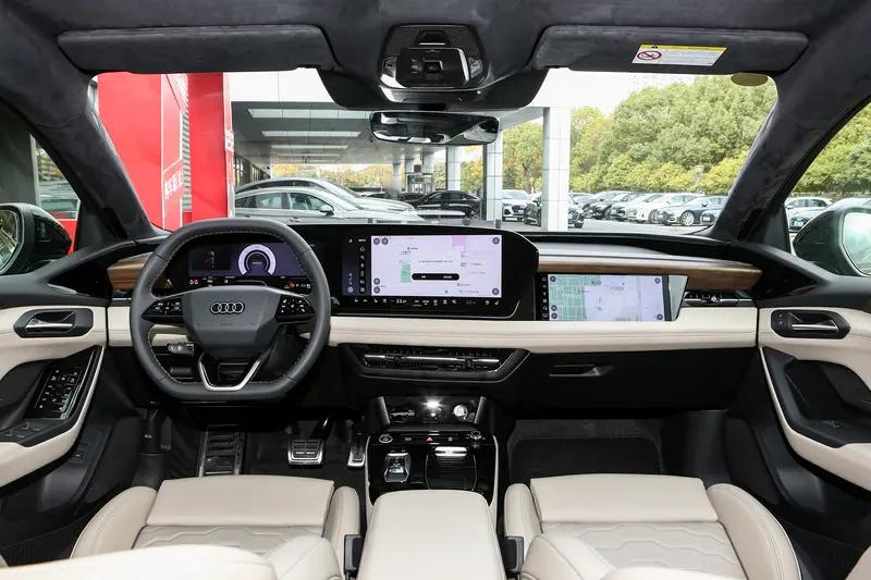 来到车内,奥迪A6L e-tron的中控台设计与此前发布的燃油版A5L保持了高度相似,三块液晶屏幕十分引人注目。其中仪表盘与中控屏连为一体,营造出双连屏的效果,而副驾屏的位置相对更低,在保证副驾使用之余尽量避免驾驶员分心。