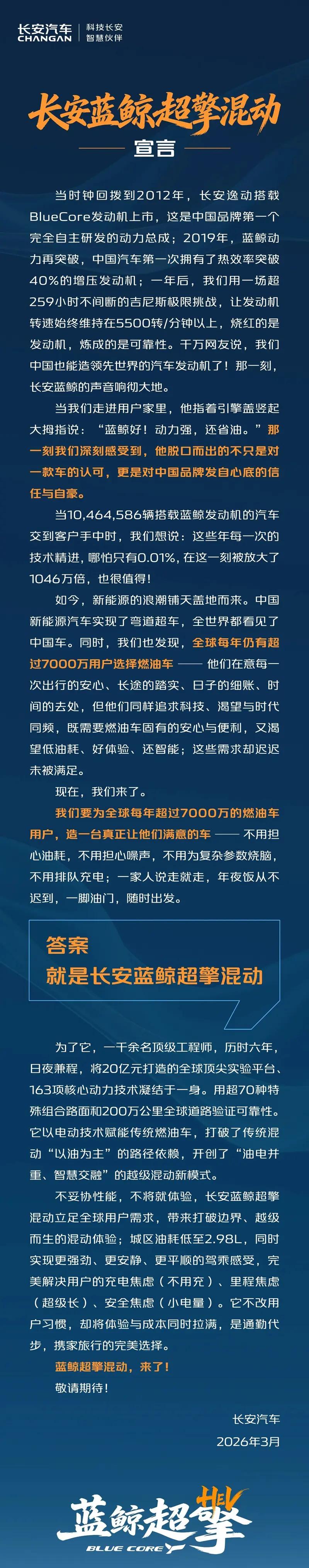 3月12日,长安汽车发表《长安蓝鲸超擎混动》宣言,正式官宣其新一代混动技术名称——“蓝鲸超擎混动”。“蓝鲸超擎混动”以电动技术赋能传统燃油车,打破了传统混动“以油为主”的路径依赖,开创了“油电并重、智慧交融”的越级混动新模式,带来打破边界、越级而生的混动体验。在“蓝鲸超擎混动”赋能下,城区油耗低至2.98L/100km,同时实现更强劲、更安静、更平顺的驾乘感受。