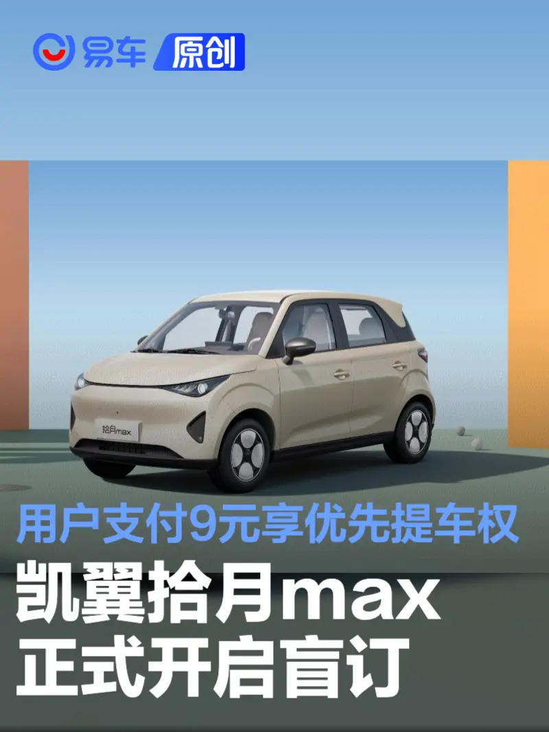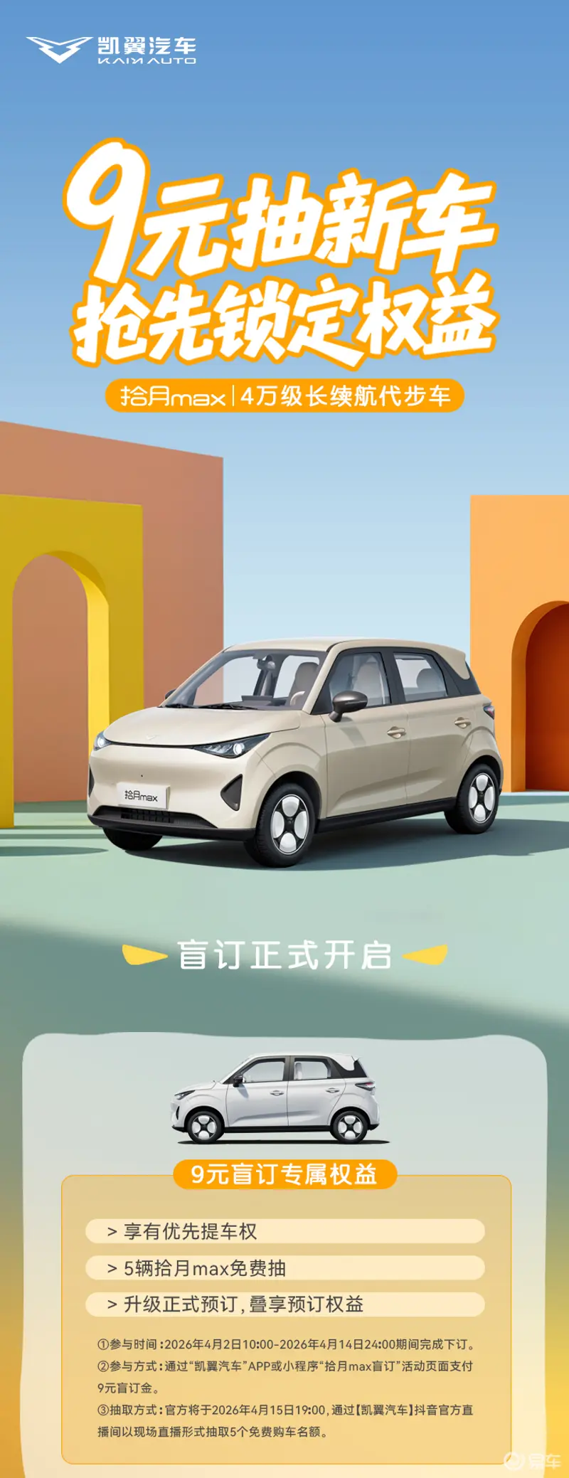 易车讯 4月2日,凯翼拾月max正式开启线上盲订,用户支付9元(随时可退)即可盲定新车,享优先提车权,更有机会免费抽新车。