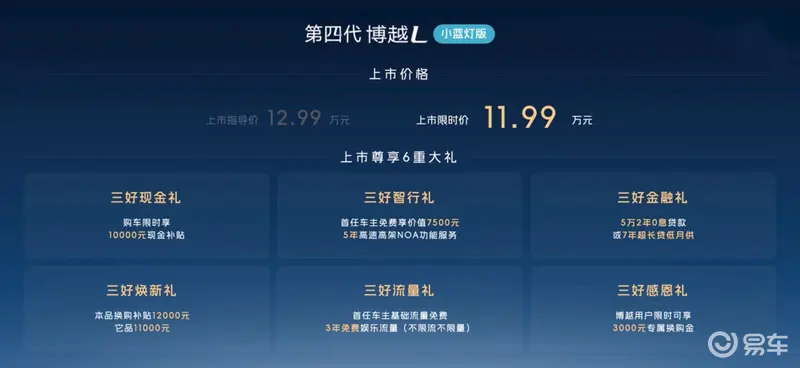 新车上市的同时官方还推出尊享6重大礼,包含购车限时享10000元现金补贴、首任车主免费享价值7500元5年高速高架NOA功能服务、5万2年0息贷款或7年超长贷低月供、本品换购补贴12000元它品11000元、首任车主基础流量免费3年免费娱乐流量(不限流不限量)以及博越用户限时可享3000元专属换购金。