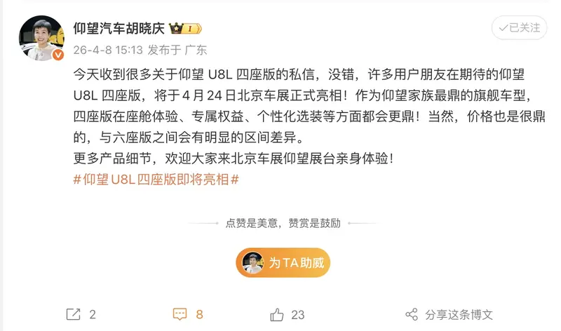 易车讯 4月8日,仰望销售事业部总经理胡晓庆在社交媒体上宣布,仰望U8L四座版将于4月24日北京车展正式亮相。胡晓庆表示,作为仰望家族最鼎的旗舰车型,四座版在座舱体验、专属权益、个性化选装等方面都会更鼎!当然,价格也是很鼎的,与六座版之间会有明显的区间差异。