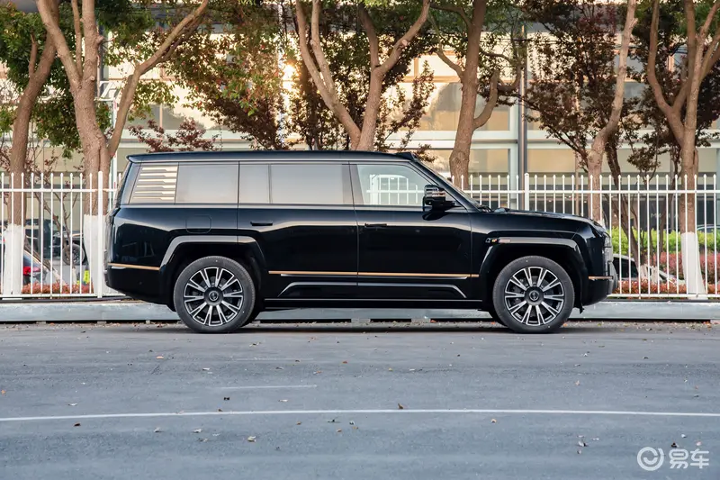 车身侧面,新车整体遵循“鼎立天地”的设计哲学,以方正线条勾勒出威严气场,大气磅礴、纵览四方。细节之处熏黑处理的前保险杠、极简式轮眉、车身同色的侧裙以及隐藏式尾灯,让车身设计更加简洁统一,高端行政气息自然流露。