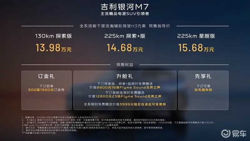 官方还宣布,2026年4月9日预售开启至吉利银河M7上市当日中午12:00完成下订用户均可享预付500元预订金综合限时享至高价值17799元预售权益。具体包含下订即享500元抵1500元订金券;下订130km操索版/225km探索+版限时赠送价值8800元的16扬Flyme Sound无界之声;下订225km星舰版限时赠送价值12800元的23扬Flyme Sound无界之声;全系限时赠送价值3999元阻尼自适应可变悬架。此外,下订可享优先提车权。