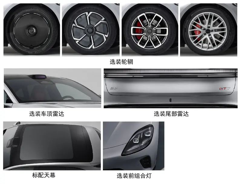 车身尺寸方面,启境GT7长宽高为5050mm*1980mm*1470mm,轴距长达3000mm。新车搭载21英寸曜黑运动轮毂,并配备德国大陆高性能四活塞固定卡钳,运动基因显露无疑。